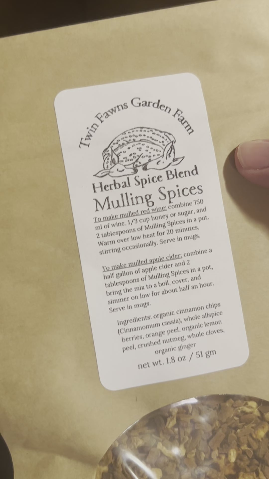 To make mulled red wine: combine 750 ml of wine, 1/3 cup honey or sugar, and 2 tablespoons of Mulling Spices in a pot. Warm over low heat for 20 minutes, stirring occasionally. Serve in mugs. To make mulled apple cider: combine a half gallon of apple cider and 2 tablespoons of Mulling Spices in a pot, bring the mix to a boil, cover, and simmer on low for about half an hour. Serve in mugs.